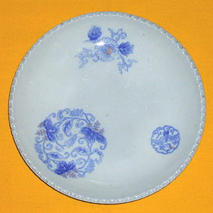 井ヶ田芳郎氏寄贈。大きな葵のかたまりと小さな鶴丸(しかし葵との関係から鳳凰丸かもしれない)。もうひとつは菊花をディフォルメした唐草か。朱の入った上品な白イゲだ。