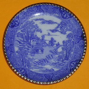 帆船あり楼閣ありの桃源郷。橋の上を主人と門弟が歩いて行く。縁周りのギッシリ描き込まれた唐草や窓絵が途中で切れているのを見ると、本来はもっと大きな皿用の印判なのだろう。