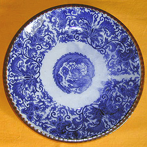 絵が流れてこの皿を3流になってしまったが、唐草も中央でとぐろを巻く龍もなかなか美しい。3枚の銅板を縁回りに使用しているが、右端があいてしまった。