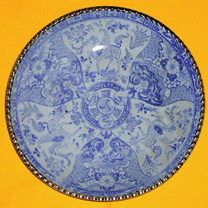 だらしのない器で(美濃だと思う)ヘタリやグラがあり、コバルトも乗りが悪くかすれている。しかし柄は面白い。ペルシア原画と思われる天馬が花畑で遊んでいる。花は日本的で牡丹、萩、菊、水仙。縁回りもペルシア模様だろうか、見たことのない模様だ。