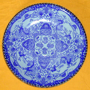 ゴテゴテしていて、すぐには何が描かれているのか判らない。中央の4つの小さな円には龍が描かれている。回りの4つの窓絵の中はどれも同じで朝日が眩しい海辺が描かれている。図柄に上下左右のない皿は使い勝手は良さそうだ。