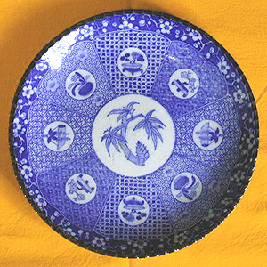 コオランの図柄として図録に載っていながら山川の銘になっている皿が手元に2種ある。コオランと山川はどういう関係か興味深い。この皿の中央には筍が描かれ、八分割の窓絵には盆栽が描かれている。しっかりした良い器だ
