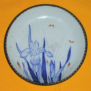 見えにくいが薄いピンクで奥にも菖蒲が描かれている。蕾が3つ、蝶が2匹。とても魅力的な皿だ。横浜の骨董市の最終日に1000円で買った。